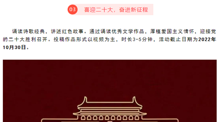 為深入開展“青春獻禮黨的二十大,強國有我新征程”主題宣傳教育活動,熱烈慶祝中華人民共和國成立73周年,引導和激勵廣大師生厚植愛國主義情懷,營造網(wǎng)絡(luò)文明新風,國慶節(jié)期間,我校組織開展了豐富多彩的“喜迎黨的二十大 歡度國慶節(jié)”系列主題活動。廣大師生通過各級各類網(wǎng)絡(luò)平臺和線上活動,用自己的方式為祖國送上美好祝福,禮贊新時代奮進征程,以良好的精神面貌和昂揚姿態(tài)喜迎黨的二十大勝利召開。