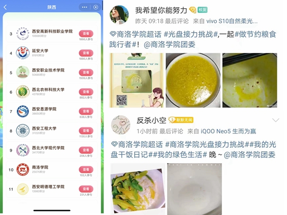 團委宣傳部組織開展了微博曬日常綠色生活照片、光盤對比照片活動,組織學(xué)生參與了以微博話題“我的綠色生活”、“我的光盤干飯日記”為主題的高?!白龉?jié)約糧食踐行者”系列活動,截至目前我?;顒臃e分在全省高校排名中位居前十。