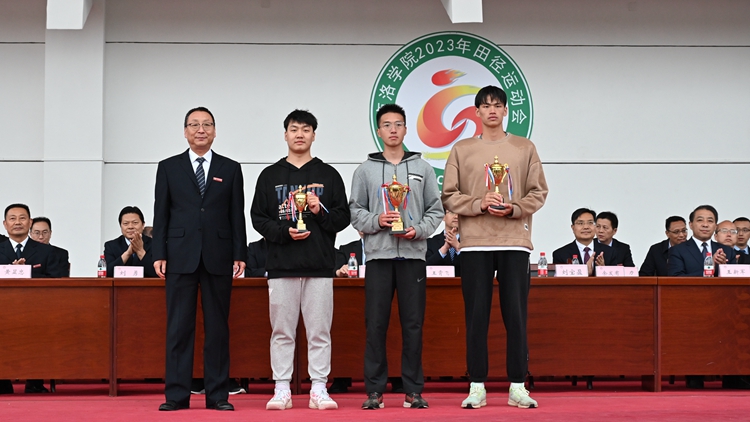 在熱烈的掌聲中,副校長劉寶盈分別為獲得體育道德風(fēng)尚獎的學(xué)院和團(tuán)體總分前三名獲獎的學(xué)院頒獎,副校長王新軍為男子總分前三名頒獎,副校長郭瑾為女子總分前三名獲獎學(xué)院頒獎。