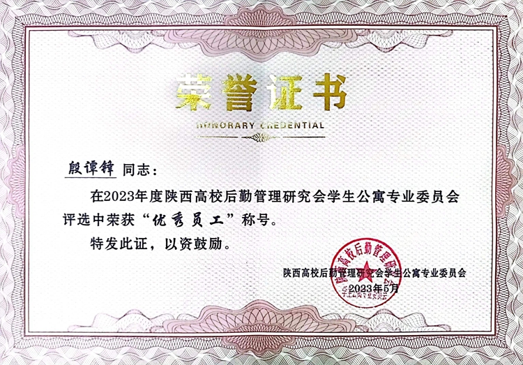 會(huì)上,陜西高校學(xué)生公寓專業(yè)委員會(huì)秘書長賈亞新宣讀了《2023年度陜西高校學(xué)生公寓先進(jìn)集體、服務(wù)標(biāo)兵、優(yōu)秀員工》的表彰決定。我校后勤保障處獲得“陜西高校學(xué)生公寓先進(jìn)集體”榮譽(yù)稱號(hào),后勤保障處副處長殷譚鋒被評(píng)為陜西高校學(xué)生公寓“優(yōu)秀員工”,后勤保障處職工王鎖鋒被評(píng)為陜西高校學(xué)生公寓“服務(wù)標(biāo)兵”。后勤保障處處長李彥廣作為嘉賓之一為優(yōu)秀員工代表頒發(fā)獎(jiǎng)狀。