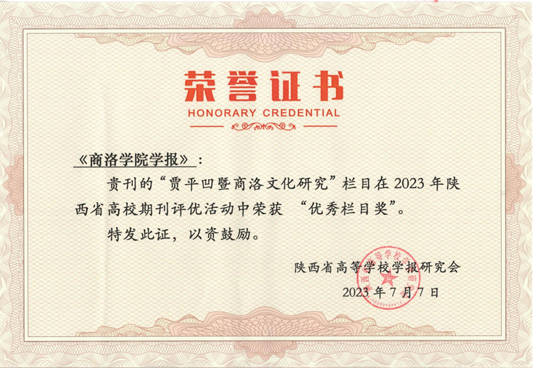 7月7日,2023年度陜西省高校期刊評優(yōu)結(jié)果揭曉,我校主辦的《商洛學(xué)院學(xué)報(bào)》被評為“陜西高校精品社科期刊”,學(xué)報(bào)優(yōu)勢欄目“賈平凹暨商洛文化研究”獲“優(yōu)秀欄目獎(jiǎng)”。