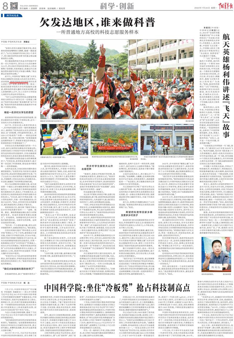 7月24日,《中國(guó)青年報(bào)》第8版以《欠發(fā)達(dá)地區(qū),誰(shuí)來(lái)做科普一所普通地方高校的科技志愿服務(wù)樣本》為題,對(duì)我校流動(dòng)科技館科技志愿服務(wù)項(xiàng)目進(jìn)行了專題報(bào)道。