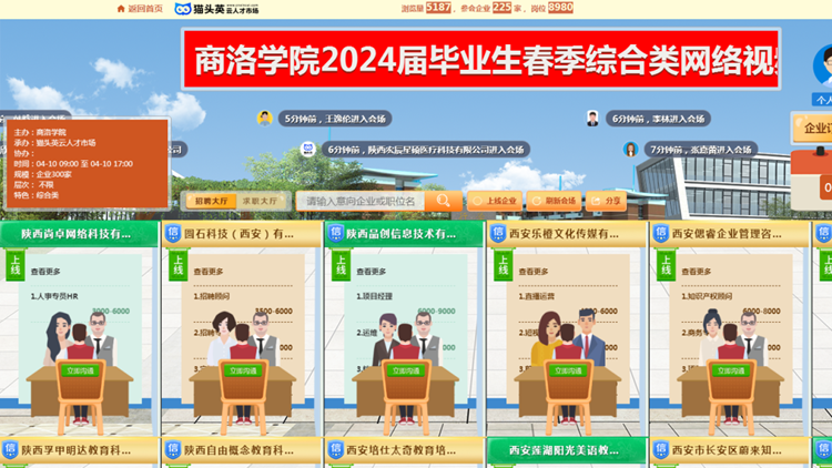 為充分搶抓春季就業(yè)“黃金期”,促進(jìn)畢業(yè)生順利就業(yè)、充分就業(yè)、穩(wěn)定就業(yè),4月10日,2024屆畢業(yè)生春季綜合類網(wǎng)絡(luò)視頻招聘會(huì)暨“職引未來”大中城市聯(lián)合招聘(商洛站)高校畢業(yè)生專場(chǎng)招聘會(huì)在我校順利舉辦。本次招聘會(huì)由省教育廳、省就業(yè)留學(xué)中心指導(dǎo),我校和商洛市人社局主辦,我校就業(yè)中心和商洛市人才中心承辦。