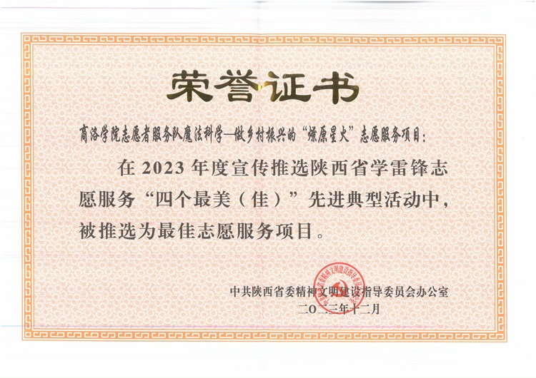 活動現(xiàn)場為2023年度科技志愿服務(wù)先進(jìn)典型最佳科技志愿服務(wù)組織、2023年度陜西省學(xué)雷鋒志愿服務(wù)“四個最美(佳)”先進(jìn)典型頒獎,并舉行了省人民醫(yī)院“科學(xué)研究協(xié)作單位”授牌儀式和陜西省人民醫(yī)院青年科學(xué)技術(shù)協(xié)會頒牌儀式。我校化材學(xué)院曹寶月教授領(lǐng)銜組織的商洛學(xué)院志愿者服務(wù)隊魔法科學(xué)——做鄉(xiāng)村振興的“燎原星火”志愿服務(wù)項目,入選陜西省學(xué)雷鋒志愿服務(wù)最佳志愿服務(wù)項目并受邀領(lǐng)獎。