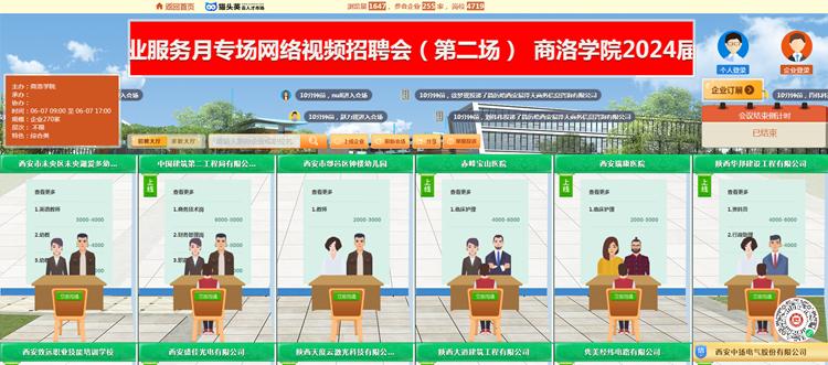 為充分落實(shí)2024屆畢業(yè)生就業(yè)“百日沖刺”行動(dòng)方案,全面促進(jìn)2024屆畢業(yè)生更加充分、更高質(zhì)量就業(yè),6月7日,我校依托貓頭鷹云就業(yè)平臺(tái)舉辦2024屆畢業(yè)生春季綜合類(lèi)暨民營(yíng)企業(yè)服務(wù)月專(zhuān)場(chǎng)網(wǎng)絡(luò)視頻招聘會(huì)(第二場(chǎng))。通過(guò)搭建“互聯(lián)網(wǎng)+視聘”線(xiàn)上平臺(tái),精準(zhǔn)對(duì)接畢業(yè)生求職需求,促進(jìn)畢業(yè)生實(shí)現(xiàn)更高質(zhì)量、更加充分就業(yè)。本次招聘會(huì)由省教育廳、省就業(yè)留學(xué)中心指導(dǎo),我校和商洛市人社局主辦,我校就業(yè)中心和商洛市人才中心承辦。