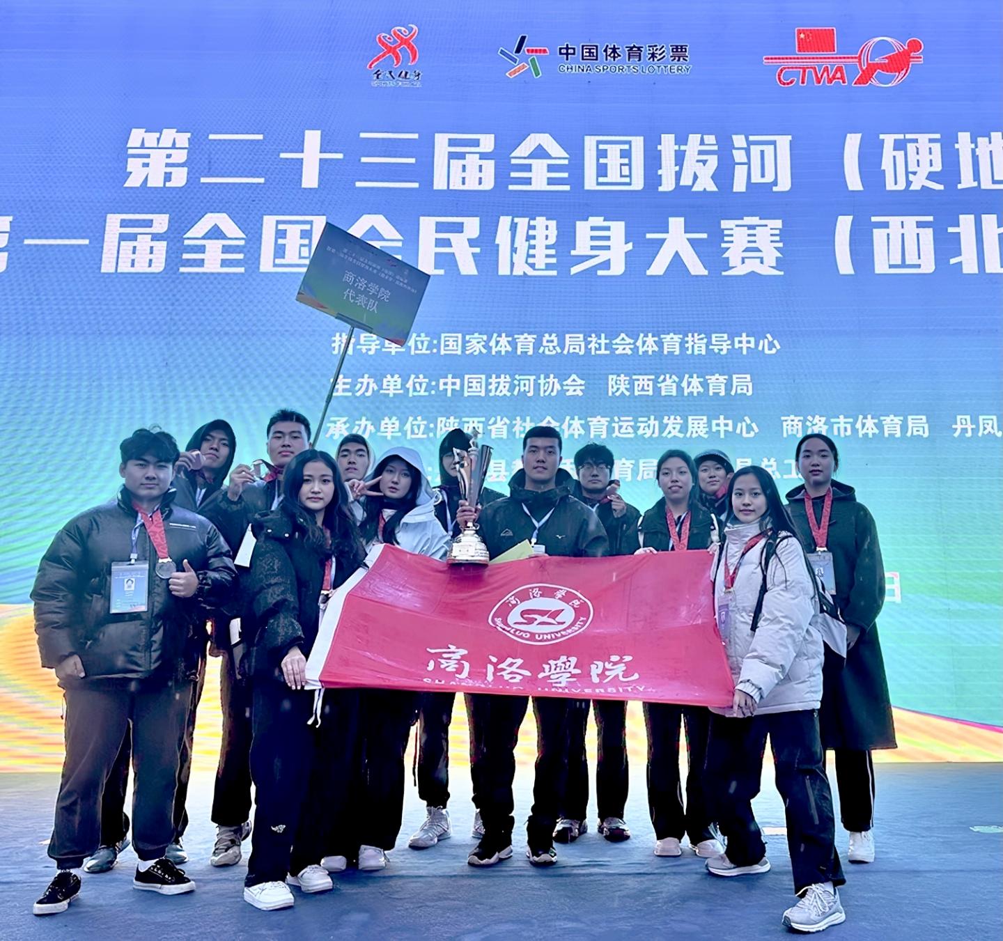11月15日-17日,第二十三屆全國拔河(硬地)錦標賽暨第一屆全國全民健身大賽(西北區(qū)·陜西丹鳳站)在商洛丹鳳體育館舉行。商洛學院選派12名參賽隊員分別參加高校組混合580公斤級和900公斤級比賽,其中在混合900公斤級比賽中榮獲第一名,在580公斤級比賽中榮獲第六名。