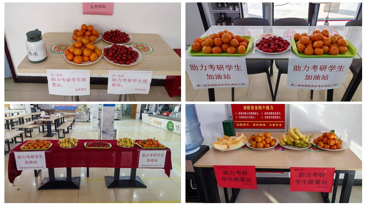 各學(xué)生食堂設(shè)立“考研加油站”,為考研學(xué)生免費提供各類水果,冬至當(dāng)天,教工食堂為研究生招生考試考務(wù)人員及工作人員提供了手工水餃。