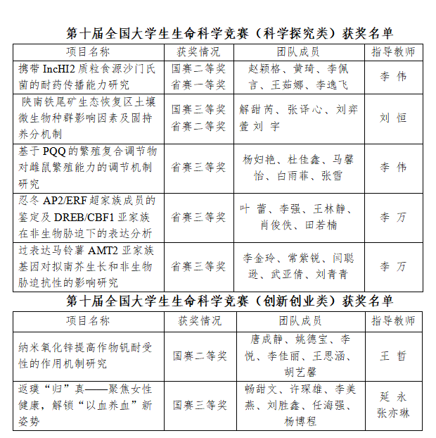 近日,第十屆全國(guó)大學(xué)生生命科學(xué)競(jìng)賽科學(xué)探究類(lèi)和創(chuàng)新創(chuàng)業(yè)類(lèi)全國(guó)總決賽分別落幕。我校學(xué)生在本屆競(jìng)賽中表現(xiàn)出色,榮獲第十屆全國(guó)大學(xué)生生命科學(xué)競(jìng)賽科學(xué)探究類(lèi)全國(guó)總決賽二等獎(jiǎng)1項(xiàng)、三等獎(jiǎng)1項(xiàng),陜西省賽區(qū)一等獎(jiǎng)1項(xiàng)、二等獎(jiǎng)1項(xiàng)、三等獎(jiǎng)3項(xiàng),榮獲創(chuàng)新創(chuàng)業(yè)類(lèi)全國(guó)總決賽二等獎(jiǎng)和三等獎(jiǎng)各1項(xiàng)。