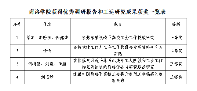 近日,陜西省教科文衛(wèi)體工會(huì)發(fā)布了《關(guān)于2024年全省教科文衛(wèi)體系統(tǒng)工會(huì)優(yōu)秀調(diào)研報(bào)告和工運(yùn)研究成果評(píng)審結(jié)果的通報(bào)》,我校工會(huì)被評(píng)為2024年全省教科文衛(wèi)體工會(huì)調(diào)查研究工作先進(jìn)單位。同時(shí),我校獲得優(yōu)秀調(diào)研報(bào)告和工運(yùn)研究成果一、二等獎(jiǎng)各1項(xiàng),三等獎(jiǎng)2項(xiàng)。