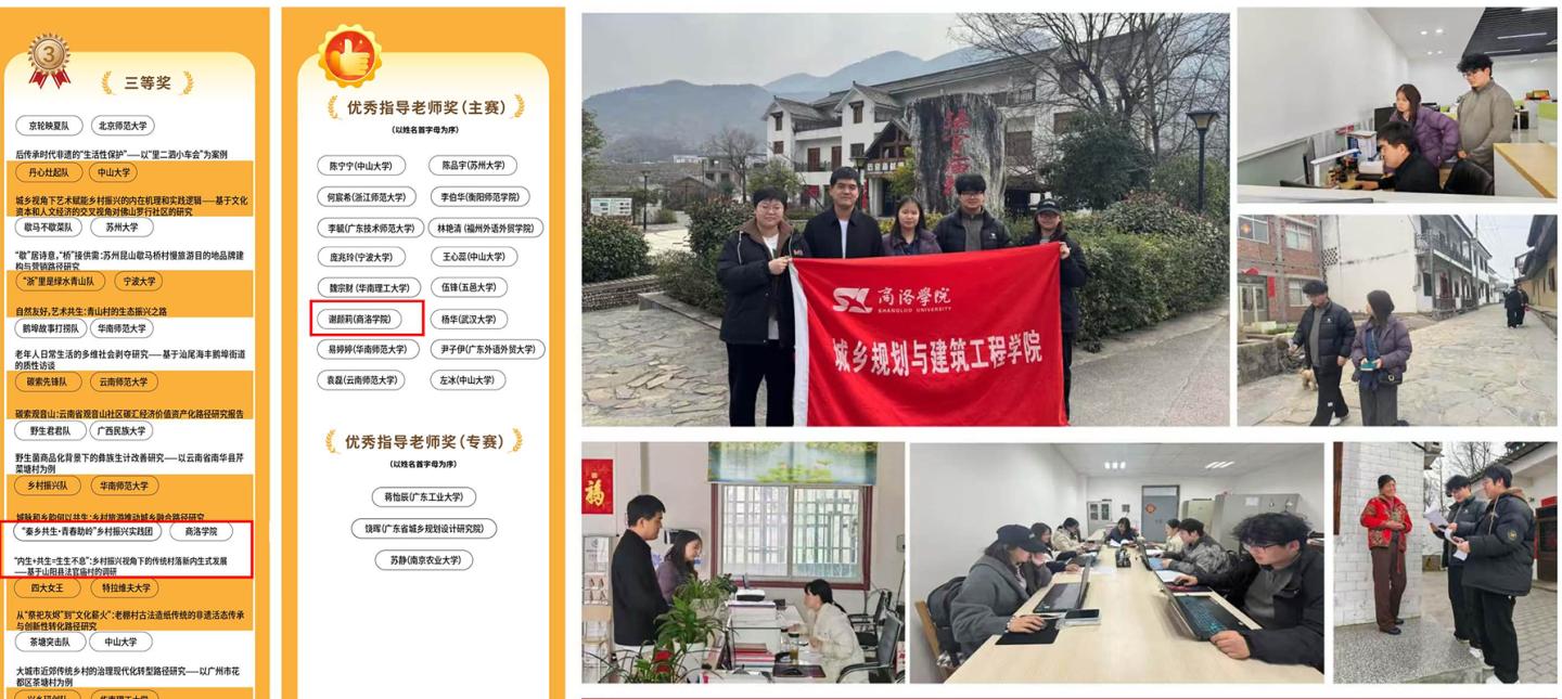 近日,第十屆全國大學(xué)生“發(fā)現(xiàn)傳統(tǒng)村落”調(diào)研大賽獲獎名單正式公布。我校建工學(xué)院“秦鄉(xiāng)共生?青春助嶺”鄉(xiāng)村振興實(shí)踐團(tuán)提交的作品《“內(nèi)生 + 共生 = 生生不息”:鄉(xiāng)村振興視角下的傳統(tǒng)村落新內(nèi)生式發(fā)展——基于山陽縣法官廟村的調(diào)研》榮獲大賽三等獎,團(tuán)隊指導(dǎo)老師謝顏莉獲評“優(yōu)秀指導(dǎo)老師”。這是我校首次在該項全國性賽事中獲獎,展現(xiàn)了我校在服務(wù)鄉(xiāng)村振興戰(zhàn)略中的實(shí)踐育人成效與跨學(xué)科創(chuàng)新能力。