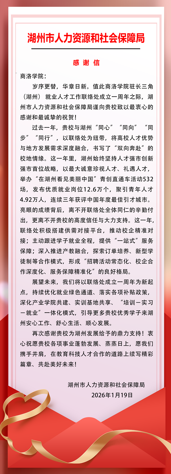 近日,湖州市人力資源和社會(huì)保障局向商洛學(xué)院發(fā)來感謝信,對(duì)學(xué)校以駐長(zhǎng)三角(湖州)就業(yè)人才工作聯(lián)絡(luò)處為紐帶,將高校人才優(yōu)勢(shì)與地方發(fā)展需求深度融合的工作實(shí)踐表示感謝,表達(dá)了與學(xué)校攜手并肩共同譜寫教育、科技、人才“三位一體”發(fā)展新篇章的良好愿景。