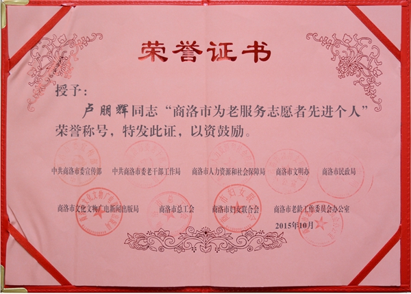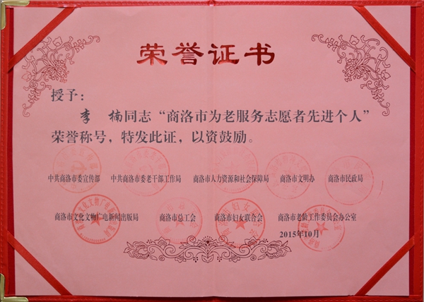 日前,中國老齡事業(yè)發(fā)展基金會發(fā)出《關于表彰全國首屆北京華夏惠眾養(yǎng)老產業(yè)投資有限公司等百家“敬老志愿服務模范單位”、溫向明等百名“最美敬老志愿者”、沈慧琴等千名“優(yōu)秀敬老志愿者”的決定》。我校學生李楠、盧朋輝榮獲全國首屆“優(yōu)秀敬老志愿者”榮譽稱號。同時二人也獲得商洛市表彰,被評為“商洛市為老服務志愿者先進個人”。