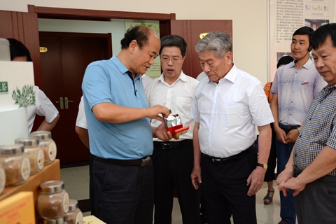 在植物學(xué)優(yōu)勢(shì)學(xué)科展室,趙鵬大院士詳細(xì)了解了我校培育的小麥新品種和現(xiàn)代中藥產(chǎn)品,品嘗了我校開發(fā)的“商山養(yǎng)生紅”保健酒。他建議我校深入研究整理商洛區(qū)域土壤水質(zhì)特性,有針對(duì)性地研發(fā)具有地域特色的良種和農(nóng)藥、肥料等產(chǎn)品。