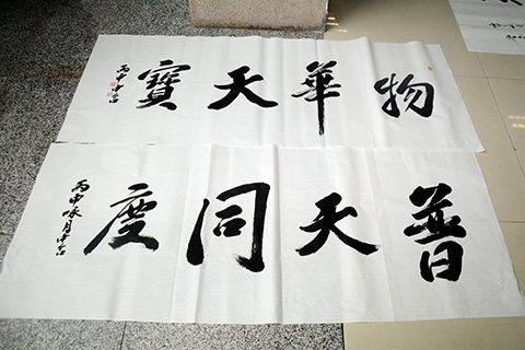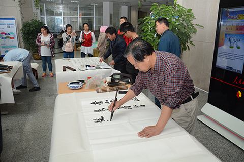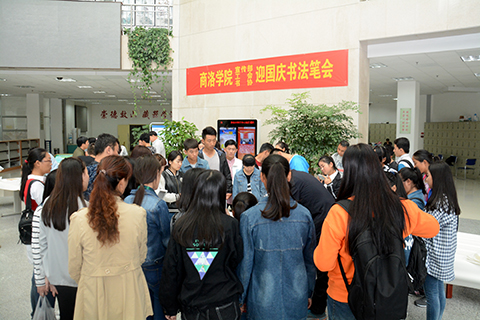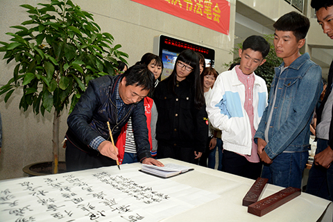 9月28日下午,由宣傳部、工會、校書法協(xié)會聯(lián)合舉辦的“迎國慶書法筆會”在圖書館一樓大廳舉行。校書協(xié)會員們早早來到現(xiàn)場,調(diào)墨、潤筆、揮毫,一幅幅作品從筆端涌出,飽含著對偉大祖國的深深眷戀與真摯祝福!現(xiàn)場引來同學(xué)們的熱情圍觀,也引發(fā)了青年學(xué)子的廣泛共鳴。