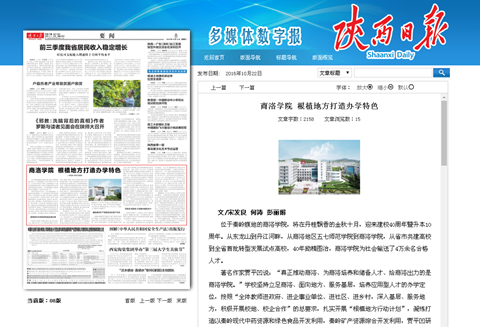10月22日,《陜西日?qǐng)?bào)》以《商洛學(xué)院 根植地方打造辦學(xué)特色》為題對(duì)我校辦學(xué)成就進(jìn)行報(bào)道。文章從“聚焦現(xiàn)代中藥和綠色食品做文章,瞄準(zhǔn)秦嶺礦產(chǎn)資源綜合利用下功夫,寫(xiě)商洛 畫(huà)商洛 打造秦嶺最美名片”三個(gè)方面,回顧了我校建校40年、升本10年來(lái),堅(jiān)持立足商洛、面向地方、服務(wù)基層,凝練打造以秦嶺現(xiàn)代中藥資源和綠色食品開(kāi)發(fā)利用,秦嶺礦產(chǎn)資源綜合開(kāi)發(fā)利用,賈平凹研究、秦嶺畫(huà)派等地方文化傳承創(chuàng)新為代表的辦學(xué)特色,深入開(kāi)展“根植地方行動(dòng)計(jì)劃”的實(shí)踐和成果。