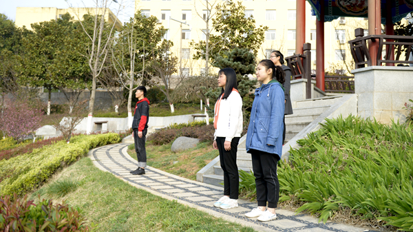 7:10,參加升旗儀式的全體師生列隊整齊、精神飽滿,佇立在升旗臺前。化材學院國旗護衛(wèi)隊邁著整齊的步伐走向升旗臺,將國旗護送到升旗臺前。在雄壯的國歌聲中,鮮艷的五星紅旗冉冉升起,迎風飄揚?,F(xiàn)場氣氛莊嚴肅穆,在場的每個人都神情嚴肅,心潮澎湃。在運動景觀平臺晨讀和學苑路行走的同學聽到國歌聲,也立即面朝國旗方向肅立行注目禮,向國旗表達最崇高的敬意。