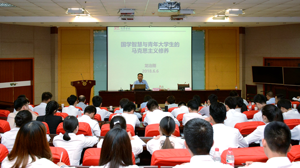 龍治剛從狹義和廣義兩個角度為同學(xué)們講解了國學(xué)的含義,并以四部分類法對國學(xué)進(jìn)行分類,簡要介紹了《經(jīng)》《史》《子》《集》各部的主要內(nèi)容。他引用鄧衛(wèi)東的國學(xué)史觀,結(jié)合自己的親身感受,從不同側(cè)面,用生動的事例、精辟的語言全方位闡述了“自然國學(xué),生命國學(xué),家庭國學(xué),公益國學(xué)”。他以孔子的人生經(jīng)歷為背景,重點(diǎn)講述了儒家思想“仁”“禮”“中庸”“義”“信”的深刻內(nèi)涵,點(diǎn)面結(jié)合,將中國傳統(tǒng)思想文化里的國學(xué)智慧娓娓道來。此外,龍治剛還從修身之道、廉政之道、法治之道、民本之道等七個方面入手,結(jié)合儒釋道文化起源和核心思想,巧妙地將優(yōu)秀傳統(tǒng)文化、現(xiàn)代教育理念、當(dāng)代青年的馬克思主義修養(yǎng)融貫一體,以生動有趣的語言引領(lǐng)青年大學(xué)生了解中國優(yōu)秀傳統(tǒng)文化中的思想精華,引導(dǎo)青年學(xué)子樹立正確的世界觀、人生觀和價(jià)值觀。
