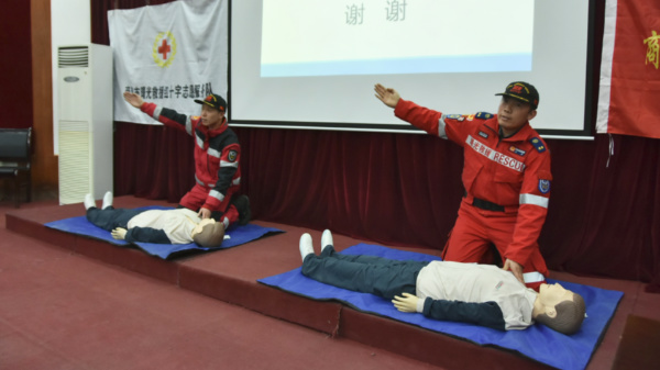 韓軼平介紹了曙光應(yīng)急救援協(xié)會的基本情況,著重介紹了曙光救援隊的成長歷程、發(fā)展規(guī)劃及成績。毛彩虹講解了心臟驟停的原因及生存鏈、除顫器的使用方法,并通過現(xiàn)場演練向同學(xué)們展示了心肺復(fù)蘇術(shù)中確認(rèn)自身環(huán)境是否安全、判斷傷員身體和生命反應(yīng)、啟動應(yīng)急反應(yīng)系統(tǒng)等6步法,并對心肺復(fù)蘇術(shù)的使用條件和標(biāo)準(zhǔn)做了詳細說明。董高平圍繞不同傷勢如何處置展開了細致講解,對手指斷傷、內(nèi)臟脫出傷等的處理方法和注意事項以及不同部位如何包扎進行了重點指導(dǎo)和演示。