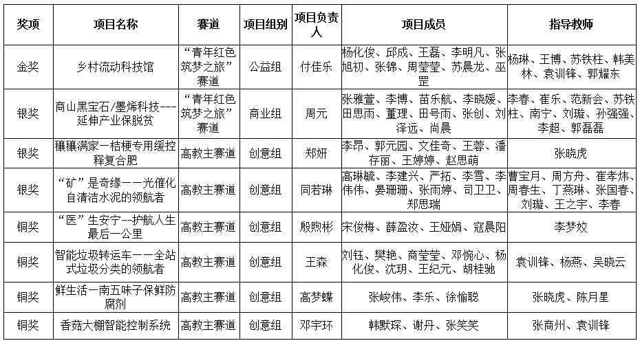 本屆大賽自今年6月啟動(dòng)以來,我省共有106所學(xué)校報(bào)名參加,參賽項(xiàng)目突破4萬(wàn)項(xiàng),較去年增加近3000項(xiàng),參賽學(xué)生突破18.4萬(wàn)人次,較去年增加1.8萬(wàn),經(jīng)校級(jí)初賽、網(wǎng)絡(luò)初審、會(huì)議評(píng)審、線上路演、評(píng)委會(huì)評(píng)審等環(huán)節(jié)后,最終產(chǎn)生金獎(jiǎng)100項(xiàng),單項(xiàng)獎(jiǎng)7項(xiàng)。我?;膶W(xué)院學(xué)生付佳樂負(fù)責(zé)的《鄉(xiāng)村流動(dòng)科技館》項(xiàng)目獲“青年紅色筑夢(mèng)之旅”賽道金獎(jiǎng);化材學(xué)院學(xué)生周元負(fù)責(zé)的《商山黑寶石/墨烯科技---延伸產(chǎn)業(yè)保脫貧》項(xiàng)目獲得“青年紅色筑夢(mèng)之旅”賽道銀獎(jiǎng);生物學(xué)院學(xué)生鄭妍負(fù)責(zé)的《穰穰滿家—桔梗專用緩控釋復(fù)合肥》項(xiàng)目、化材學(xué)院學(xué)生同若琳負(fù)責(zé)的《“礦”是奇緣——光催化自清潔水泥的領(lǐng)航者》項(xiàng)目獲得高教主賽道銀獎(jiǎng);健康管理學(xué)院學(xué)生殷煦彬負(fù)責(zé)的《“醫(yī)”生安寧--護(hù)航人生最后一公里》項(xiàng)目、生物學(xué)院學(xué)生高夢(mèng)蝶負(fù)責(zé)的《鮮生活—南五味子保鮮防腐劑》項(xiàng)目、電信學(xué)院學(xué)生王森負(fù)責(zé)的《智能垃圾轉(zhuǎn)運(yùn)車——全站式垃圾分類的領(lǐng)航者》項(xiàng)目、電信學(xué)院學(xué)生鄧宇環(huán)負(fù)責(zé)的《香菇大棚智能控制系統(tǒng)》項(xiàng)目獲得高教主賽道銅獎(jiǎng)。