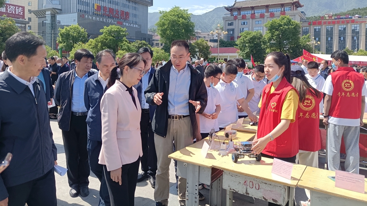 5月24日,由商洛市委宣傳部、科技局及科協(xié)聯(lián)合我校舉辦的2021年商洛市科技活動周啟動儀式在山陽縣人民廣場舉行。商洛市副市長權(quán)雅寧出席活動并講話。商洛市委宣傳部、科技局及科協(xié),山陽縣委、縣政府及我??萍继庁撠?zé)人,省市科技特派員代表、我校“流動科技館”成員及山陽縣學(xué)生代表、社會各界群眾1000余人參加了啟動儀式。