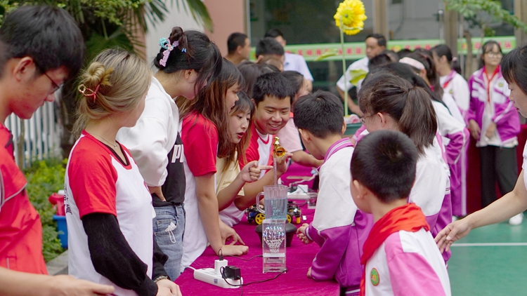 活動中,“人才服務團”的6名教師作了精彩的科普知識講座。生物學院教師劉長命、王洋,化材學院教師王毅夢分別作了題為《植物科學與我們的生活》《豐富多彩的昆蟲世界及人工琥珀標本制作》《“形狀記憶”小星星》的知識講座。電信學院教師李亞文向?qū)W生們展示了大學生創(chuàng)新創(chuàng)業(yè)作品《神奇的校車》、趙杰講授了《少兒機器人編程》課程、王博講解了《螃蟹機器人和人體感應太陽花的奧秘》。他們的講解風趣幽默、形象生動、通俗易懂,激發(fā)了現(xiàn)場學生們探索科學的興趣,現(xiàn)場氣氛輕松歡快,歡笑聲和掌聲不斷。