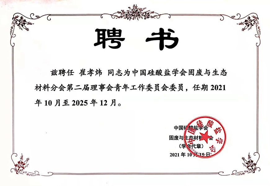 我校崔孝煒博士受聘為中國硅酸鹽學(xué)會固廢與生態(tài)材料分會青委會委員