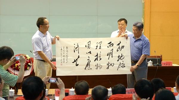 為表達(dá)對趙鵬大院士的敬意和感謝,龍治剛代表學(xué)校向趙院士贈送了“勘地脈而明物理,格物用以應(yīng)濟世”書法作品?;膶W(xué)院青年教師向趙院士贈送了鮮花。