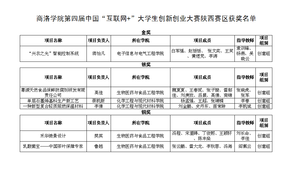 自2015年“互聯(lián)網(wǎng)+”大賽開展以來(lái),我校把大賽作為應(yīng)用型人才培養(yǎng)的重要平臺(tái),積極開展教學(xué)改革探索,把創(chuàng)新創(chuàng)業(yè)教育融入人才培養(yǎng),切實(shí)提高學(xué)生的創(chuàng)新精神、創(chuàng)業(yè)意識(shí)和創(chuàng)新創(chuàng)業(yè)能力。學(xué)校制定了《商洛學(xué)院學(xué)生創(chuàng)新創(chuàng)業(yè)教育實(shí)施方案》《商洛學(xué)院學(xué)生創(chuàng)新創(chuàng)業(yè)學(xué)分認(rèn)定辦法》,建立了由54名教師組成的校級(jí)創(chuàng)新創(chuàng)業(yè)教育專家?guī)?,建有校?jí)和院級(jí)眾創(chuàng)空間,培育、孵化創(chuàng)新創(chuàng)業(yè)項(xiàng)目,對(duì)先進(jìn)集體、優(yōu)勝團(tuán)隊(duì)及標(biāo)兵、優(yōu)秀指導(dǎo)教師等進(jìn)行表彰獎(jiǎng)勵(lì)。為做好本屆大賽各項(xiàng)工作,我校成立了以校長(zhǎng)為組長(zhǎng)的校賽組委會(huì),制定具體實(shí)施方案,鼓勵(lì)激勵(lì)廣大學(xué)生積極參加。針對(duì)288個(gè)參賽項(xiàng)目,學(xué)校聘請(qǐng)校外專家對(duì)項(xiàng)目負(fù)責(zé)人及指導(dǎo)教師進(jìn)行了多輪培訓(xùn),對(duì)項(xiàng)目精心打磨。經(jīng)過(guò)二級(jí)學(xué)院院內(nèi)賽和校內(nèi)預(yù)賽、初賽、決賽,評(píng)選出校級(jí)金獎(jiǎng)10項(xiàng)、銀獎(jiǎng)20項(xiàng)、銅獎(jiǎng)30項(xiàng)。在暑假期間,教務(wù)處組織校級(jí)10項(xiàng)金獎(jiǎng)項(xiàng)目負(fù)責(zé)人和指導(dǎo)教師進(jìn)行封閉訓(xùn)練,遴選9個(gè)項(xiàng)目代表學(xué)校參加陜西省復(fù)賽,最終6項(xiàng)獲獎(jiǎng)。