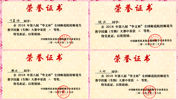 為了參加此次大賽,我校生物學(xué)院認(rèn)真組織選拔參賽學(xué)生,指導(dǎo)教師精心指導(dǎo)學(xué)生備賽,按微格教學(xué)的要求和方法反復(fù)訓(xùn)練學(xué)生進(jìn)行模擬授課。4名參賽學(xué)生最終憑借穩(wěn)定的發(fā)揮在激烈的教學(xué)技能比賽中分別獲得三等獎(jiǎng)的好成績(jī)。