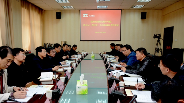 3月29日,西安航空學(xué)院黨委書(shū)記陳平社、校長(zhǎng)曹慶年、副校長(zhǎng)宋文學(xué)等一行9人來(lái)我校考察交流工作。校黨委書(shū)記龍治剛、校長(zhǎng)范新會(huì)熱情接待了陳平社、曹慶年一行。