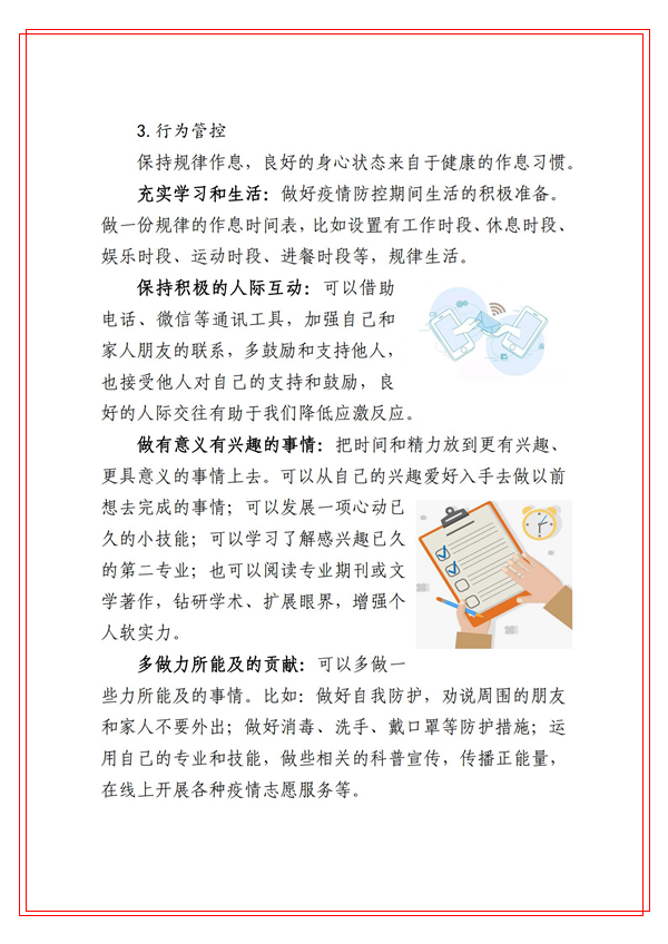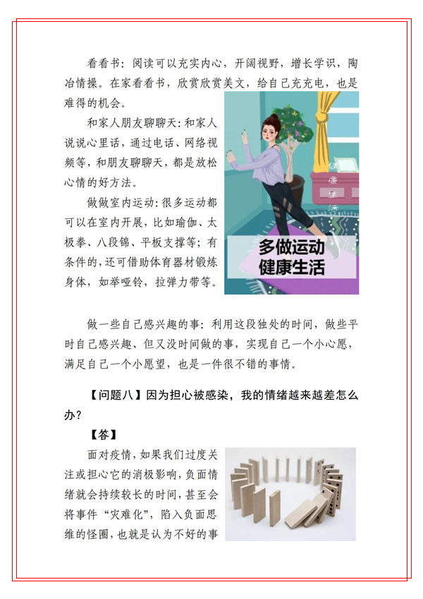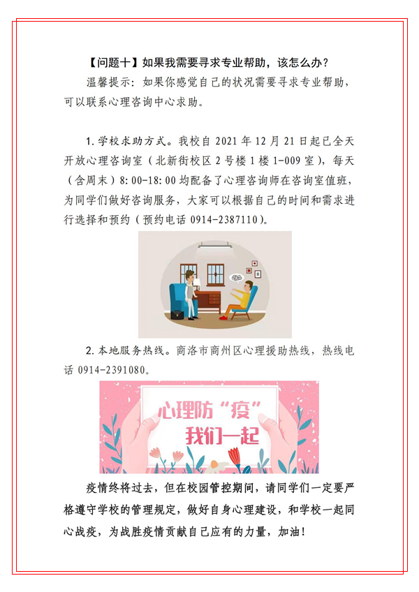為切實(shí)貫徹學(xué)校黨委關(guān)于做好本輪新冠肺炎疫情防控工作的安排部署,堅(jiān)決打贏疫情防控阻擊戰(zhàn),健康管理學(xué)院積極發(fā)揮學(xué)科專業(yè)和人才優(yōu)勢(shì),組織心理學(xué)系教師迅速行動(dòng),針對(duì)防疫期間大學(xué)生常見的心理健康問題,編寫了《商洛學(xué)院大學(xué)生防疫心理健康你問我答》。這些心理健康科普知識(shí)緊密結(jié)合我校師生實(shí)際,圖文并茂、通俗易懂,能夠有效幫助和引導(dǎo)廣大學(xué)生調(diào)試自己心理狀態(tài),維護(hù)身心健康。