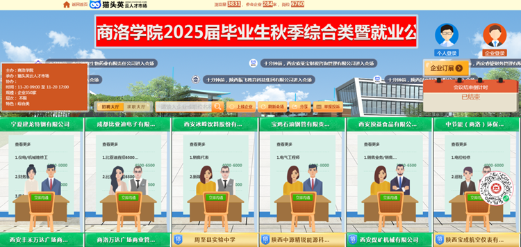為充分做好我校2025屆畢業(yè)生就業(yè)工作,充分搭建用人單位和畢業(yè)生交流平臺,確保我校畢業(yè)生更加充分、更高質(zhì)量就業(yè),12月25日,由省教育廳指導、省就業(yè)留學中心支持,我校和商洛市人社局聯(lián)合主辦,我校就業(yè)中心和商洛市人才中心承辦的2025屆畢業(yè)生冬季綜合類暨人力資源市場高校畢業(yè)生就業(yè)服務專項行動網(wǎng)絡視頻招聘會依托貓頭英云人才市場順利舉辦。