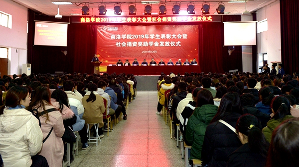 12月11日,我校2019年學(xué)生表彰大會暨社會捐資獎助學(xué)金發(fā)放儀式在大學(xué)生活動中心隆重舉行。黨委書記龍治剛,黨委副書記彭虎軍,國網(wǎng)商洛供電公司黨委書記王戰(zhàn)、中國電信商洛分公司總經(jīng)理范圳、廣東校友會正德篤行基金會理事賀濤等8家社會捐資企業(yè)及捐資個人代表出席大會。大會由學(xué)生處處長石啟英主持。