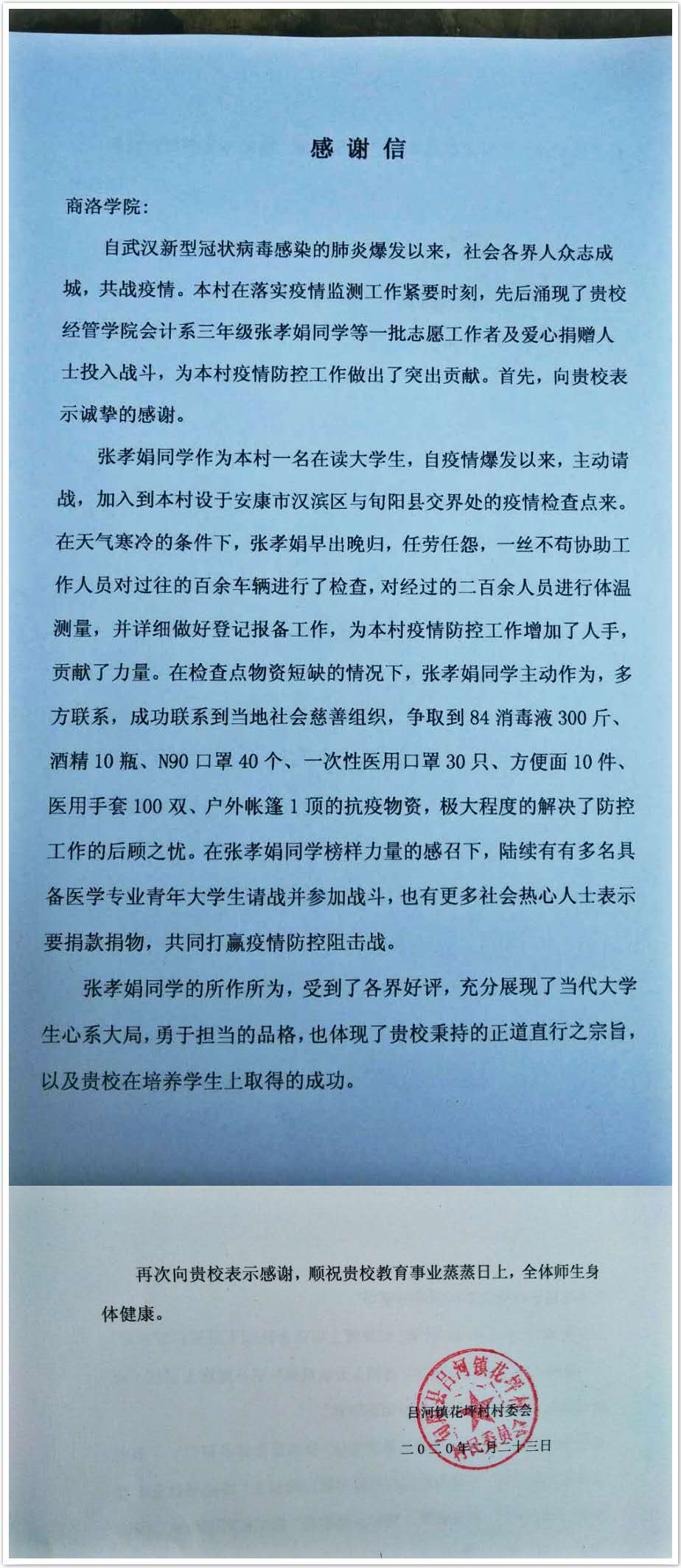 張孝娟同學的事跡受到鄉(xiāng)鎮(zhèn)領導、公安民警、村委會書記等人的一致好評,為對張孝娟同學本人以及商洛學院致謝,呂河鎮(zhèn)花坪村村委會專門向我校發(fā)來了感謝信。