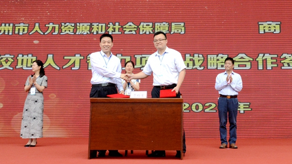 彭虎軍與郭連偉代表雙方簽署校地人才智力項(xiàng)目戰(zhàn)略合作協(xié)議,代表我校接受“人才工作站”授牌。