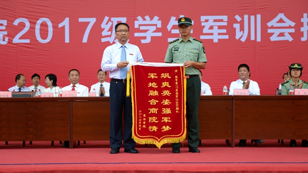 為感謝軍訓(xùn)團(tuán)教官對(duì)我校學(xué)生的悉心指導(dǎo),黨委書記龍治剛代表學(xué)校向第77集團(tuán)軍某部贈(zèng)送了寫有“颯爽英姿強(qiáng)軍夢(mèng) 軍地融合商院情”的錦旗,馬防少校代表全體教官接受了錦旗。
