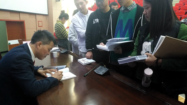 發(fā)放儀式結(jié)束后,李玉望為師生們作了題為《創(chuàng)新創(chuàng)業(yè)的幾點(diǎn)體會(huì)》的專題報(bào)告,并為師生們簽名贈(zèng)閱了書籍《醒來:知行合一傳習(xí)讀本》。報(bào)告中,李玉望結(jié)合自己求學(xué)、創(chuàng)業(yè)、守業(yè)的工作歷程、生活歷程、心路歷程,勉勵(lì)同學(xué)們立長志而不常立志;不忘初心、發(fā)揮優(yōu)勢(shì);量寬得人、身先率人、律己服人;在逆境中堅(jiān)忍不拔,茁壯成長。整場(chǎng)報(bào)告突出大學(xué)生創(chuàng)新創(chuàng)業(yè)的新思路、新理念、新目標(biāo),對(duì)廣大學(xué)生產(chǎn)生了深刻的啟發(fā)與觸動(dòng)。同學(xué)們紛紛表示受益匪淺。