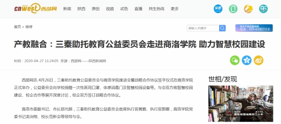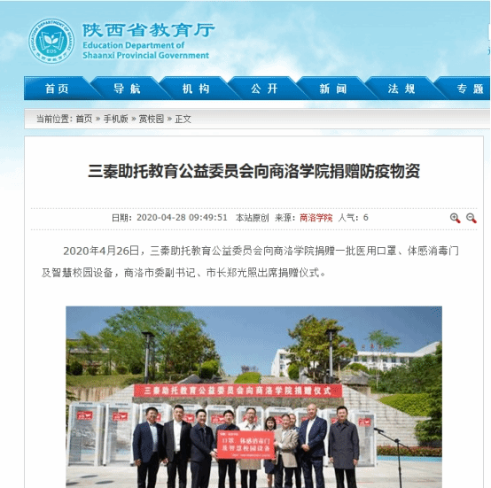 近日,陜西廣播電視臺(tái)、陜西省教育廳網(wǎng)站、西部網(wǎng)、華商網(wǎng)、新浪網(wǎng)、搜狐網(wǎng)、《商洛日?qǐng)?bào)》、商洛市人民政府網(wǎng)站、頭條新聞、中華網(wǎng)等省市10余家媒體及部分自媒體平臺(tái)對(duì)三秦助托教育公益委員會(huì)向我校捐贈(zèng)防疫物資和智慧校園設(shè)備的情況進(jìn)行了廣泛宣傳報(bào)道。