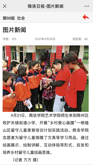 4月26日,商洛日?qǐng)?bào)三版社會(huì)版面對(duì)我校承擔(dān)的公益項(xiàng)目“鄉(xiāng)村愛心畫圃”走進(jìn)商州區(qū)牧戶關(guān)街道小學(xué)開展公益活動(dòng)進(jìn)行了報(bào)道,原文如下: