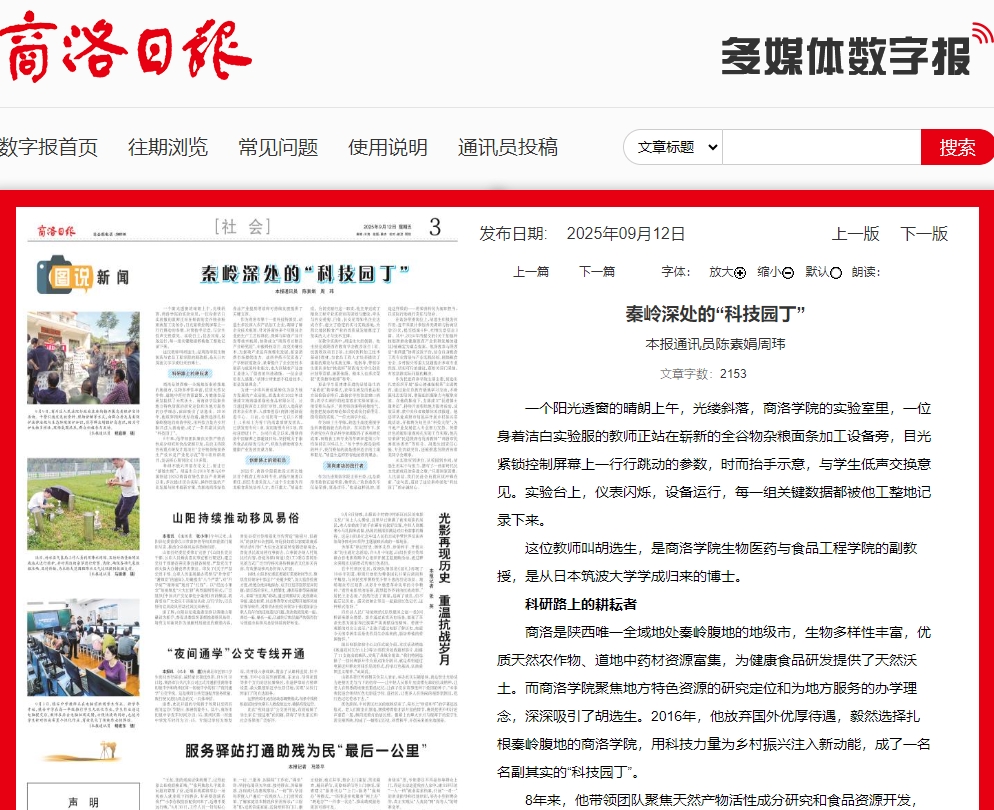 商洛是陜西唯一全域地處秦嶺腹地的地級(jí)市,生物多樣性豐富,優(yōu)質(zhì)天然農(nóng)作物、道地中藥材資源富集,為健康食品研發(fā)提供了天然沃土。而商洛學(xué)院聚焦地方特色資源的研究定位和為地方服務(wù)的辦學(xué)理念,深深吸引了胡選生。2016年,他放棄國(guó)外優(yōu)厚待遇,毅然選擇扎根秦嶺腹地的商洛學(xué)院,用科技力量為鄉(xiāng)村振興注入新動(dòng)能,成了一名名副其實(shí)的“科技園丁”。