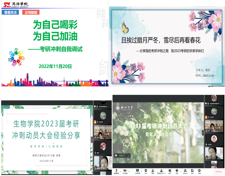 為了充分調(diào)動2023屆畢業(yè)生考研積極性,盡早明確考研目標與就業(yè)方向, 11月20日晚,生物學(xué)院通過釘釘線上平臺組織召開了2023屆考研沖刺動員大會。學(xué)院黨政領(lǐng)導(dǎo)、教師代表及2023屆考研學(xué)生參加會議。