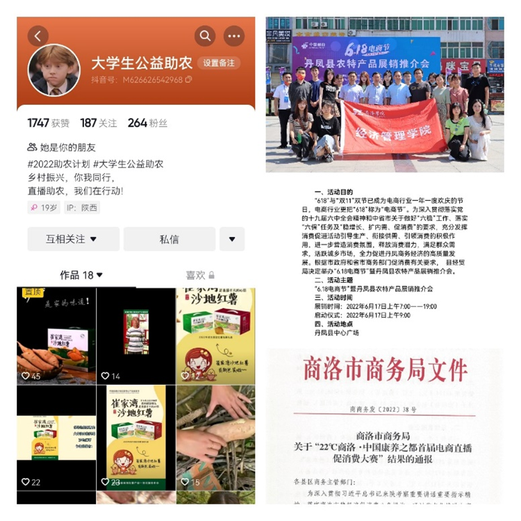 加強(qiáng)技術(shù)幫扶,推動縣域經(jīng)濟(jì)發(fā)展。學(xué)院根植地方“電子商務(wù)助力數(shù)字鄉(xiāng)村建設(shè)與縣域產(chǎn)業(yè)結(jié)構(gòu)升級團(tuán)隊”圍繞自身學(xué)科優(yōu)勢,以丹鳳縣2022年“6·18電商節(jié)”暨農(nóng)特產(chǎn)品展銷推介會為契機(jī),結(jié)合“經(jīng)管院首屆直播大賽”的舉辦,充分利用在校師生在短視頻運營、電商直播的專業(yè)積累,助力如陜西商於本草中藥材有限公司、丹鳳葡萄酒廠等丹鳳縣特色農(nóng)產(chǎn)品經(jīng)營企業(yè)開展直播銷售,形成一批具有一定人氣和粉絲量的電商助農(nóng)類運營賬號,借助電商營銷手段、模式充分促進(jìn)活動引導(dǎo)生產(chǎn)、銜接供需、引領(lǐng)消費的積極作用,活躍城鄉(xiāng)市場,促進(jìn)丹鳳電子商務(wù)經(jīng)濟(jì)的高質(zhì)量發(fā)展。