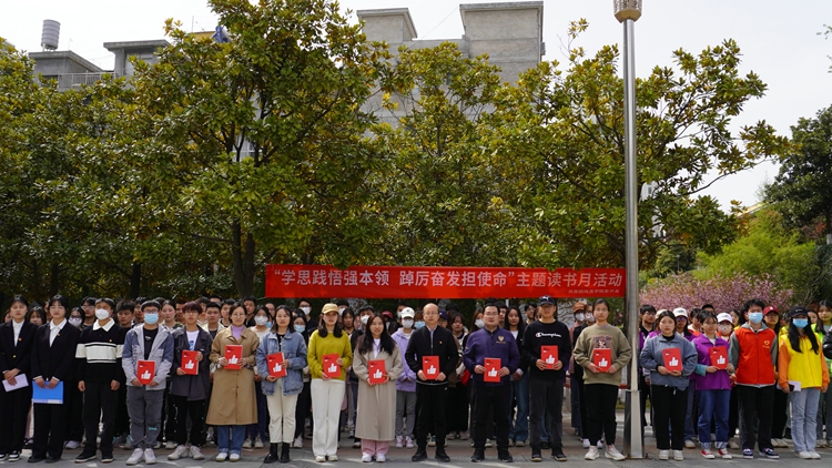 校團(tuán)委書(shū)記王攀號(hào)召全校團(tuán)學(xué)青年一是要學(xué)習(xí)貫徹落實(shí)習(xí)近平新時(shí)代中國(guó)特色社會(huì)主義思想,將習(xí)近平總書(shū)記寄予廣大青年的深切期望轉(zhuǎn)化為奮斗的原動(dòng)力,不負(fù)韶華,砥礪前行。二是要把讀書(shū)作為一種追求、一種修養(yǎng)、一種愛(ài)好和一種健康的生活方式,做到好學(xué)樂(lè)學(xué)。三是要靜下心多讀書(shū),讀好書(shū),讀經(jīng)典,讓讀書(shū)成為校園的靚麗風(fēng)景,共同塑造濃郁的書(shū)香校園文化。