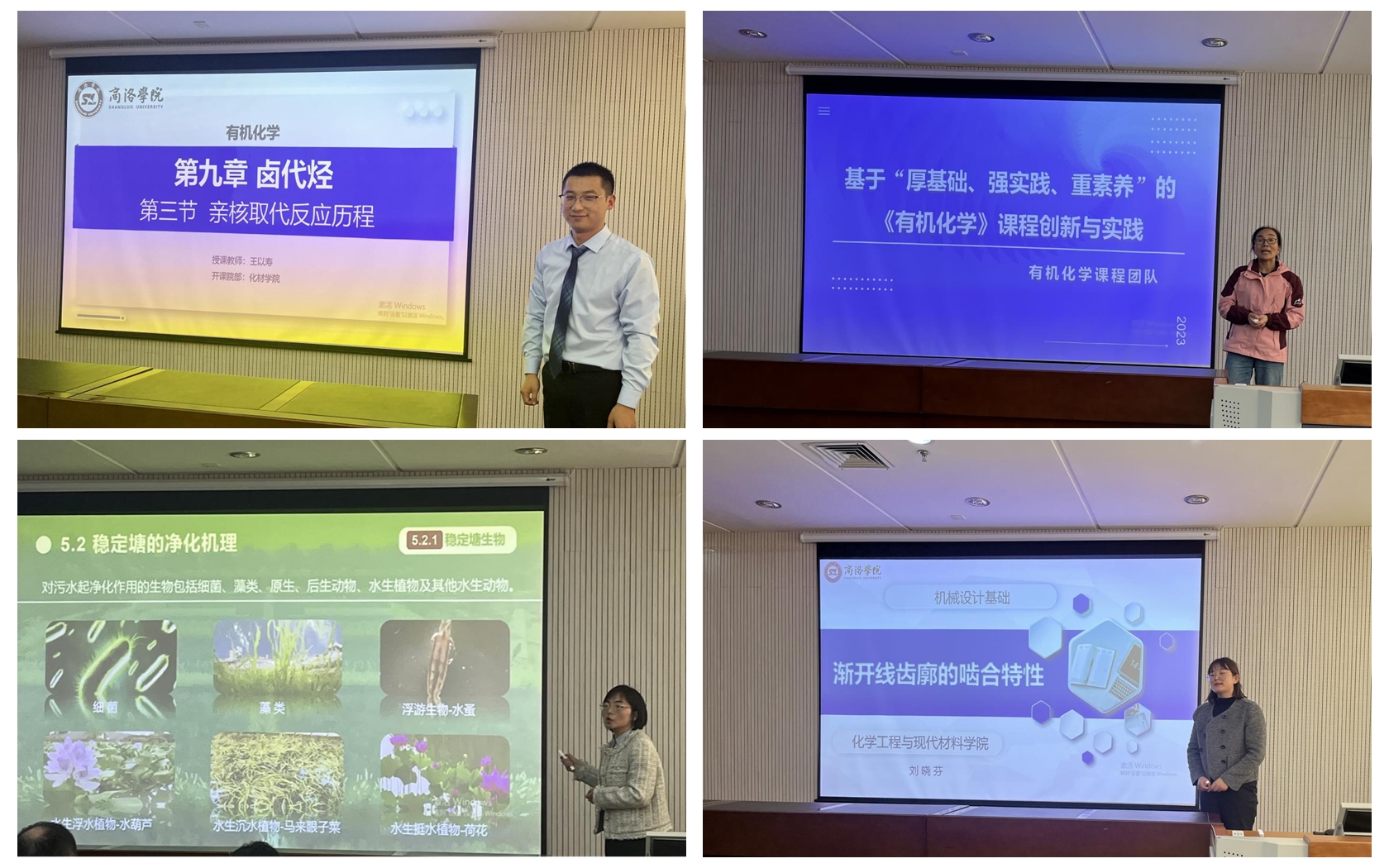商洛學(xué)院青年教師教學(xué)技能競(jìng)賽一等獎(jiǎng)獲得者徐珊、商洛學(xué)院課程思政教學(xué)標(biāo)兵劉曉芬、商洛學(xué)院課堂教學(xué)創(chuàng)新大賽一等獎(jiǎng)王香婷、商洛學(xué)院青年教師教學(xué)技能競(jìng)賽二等獎(jiǎng)、課程思政教學(xué)骨干王以壽分別以《基于“厚基礎(chǔ)、強(qiáng)實(shí)踐、重素養(yǎng)”的<有機(jī)化學(xué)>課程創(chuàng)新與實(shí)踐》《穩(wěn)定化塘——凈化機(jī)理》《漸開線齒廓的嚙合特性》《親核取代反應(yīng)歷程》為題作了示范課講授,并分享了自身教學(xué)技巧和教學(xué)設(shè)計(jì)經(jīng)驗(yàn)。