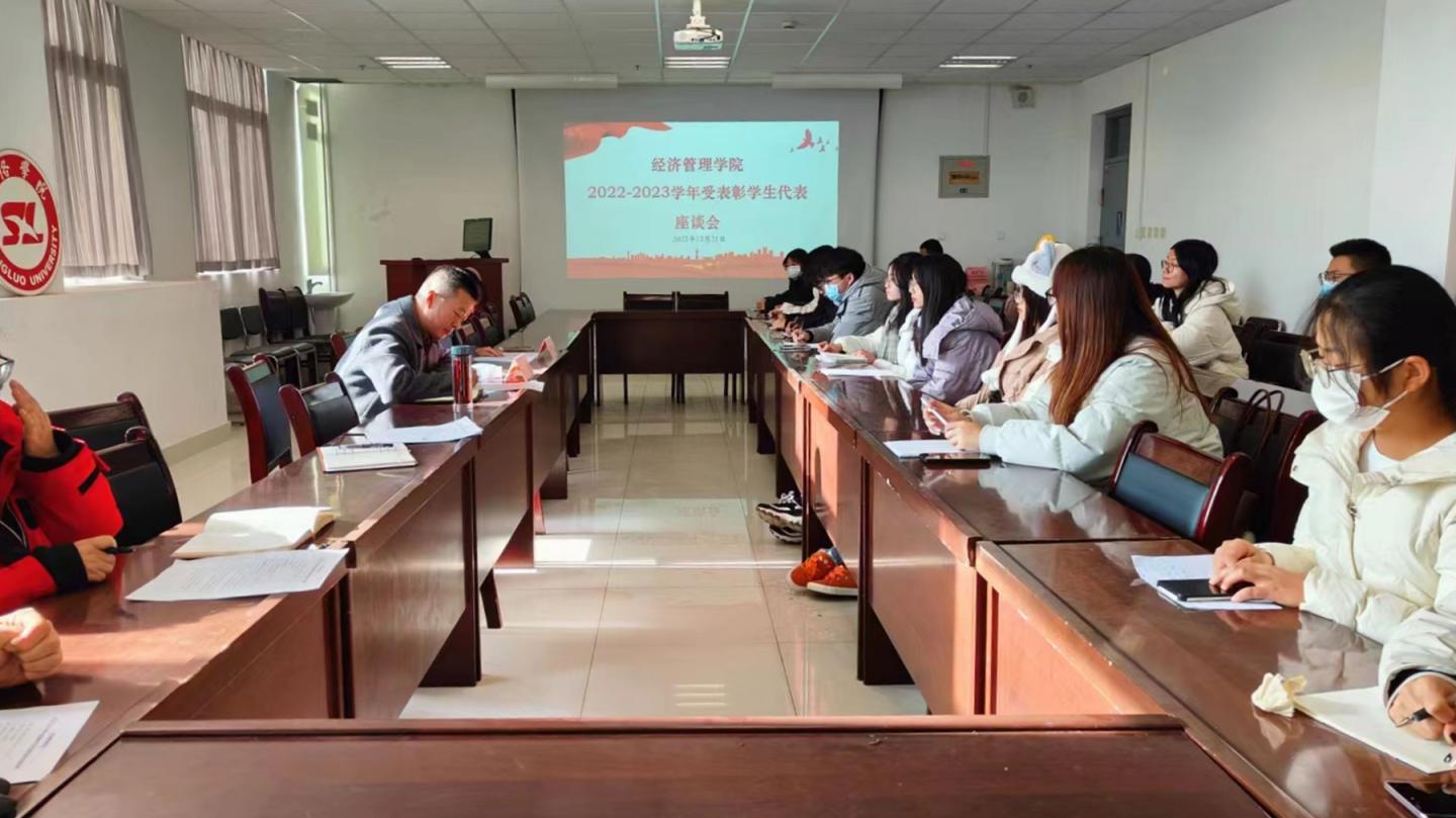 為表彰先進(jìn),樹(shù)立榜樣,營(yíng)造比學(xué)趕超的良好氛圍,12月21日,經(jīng)濟(jì)管理學(xué)院組織召開(kāi)2022-2023學(xué)年受表彰學(xué)生代表座談會(huì)。學(xué)院黨政領(lǐng)導(dǎo),全體輔導(dǎo)員和2022-2023學(xué)年榮獲三好學(xué)生、優(yōu)秀學(xué)生干部、十佳大學(xué)生、先進(jìn)班集體的學(xué)生代表30余人參加會(huì)議。會(huì)議由學(xué)院黨委書記高擴(kuò)昌主持。