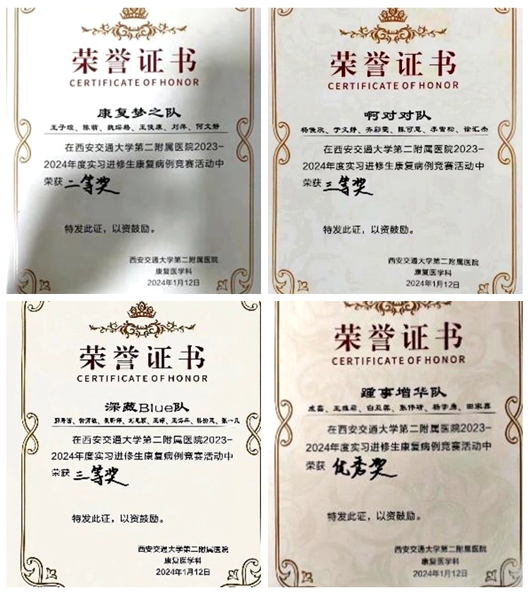 初賽階段,在西安交大二附院康復(fù)醫(yī)學(xué)科舉辦2023-2024年度康復(fù)實(shí)習(xí)生康復(fù)病案競(jìng)賽活動(dòng)中,匯集了來(lái)自陜西中醫(yī)藥大學(xué)、西安醫(yī)學(xué)院、西安交通大學(xué)城市學(xué)院、西安體育學(xué)院等院校的36名優(yōu)秀康復(fù)治療實(shí)習(xí)生,分成6組進(jìn)行競(jìng)賽角逐。我??祻?fù)實(shí)習(xí)生在比賽中沉著應(yīng)對(duì),對(duì)康復(fù)病案進(jìn)行分析和診斷,憑借扎實(shí)的知識(shí)儲(chǔ)備,嚴(yán)謹(jǐn)?shù)呐R床思維能力及規(guī)范的技能操作,最終取得優(yōu)秀的成績(jī)。其中劉萍獲得二等獎(jiǎng),張一凡、王海萍、陳可意3人獲得三等獎(jiǎng),王雅君、成鑫2人獲得優(yōu)秀獎(jiǎng)。