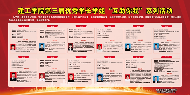 為充分發(fā)揮優(yōu)秀學生的榜樣示范引領作用,展現(xiàn)建工學院“黨建引領就業(yè)文化育人體系”黨建品牌建設的階段性成果,近日,建工學院開展第三屆優(yōu)秀學長學姐“互助你我”系列活動。來自2024屆地理科學、工程管理等12名優(yōu)秀學生代表分別圍繞研究生考試、國企面試、畢業(yè)簡歷設計、公務員及事業(yè)單位考試等方面做了經(jīng)驗交流,2021、2022、2023級學生參加本次活動。