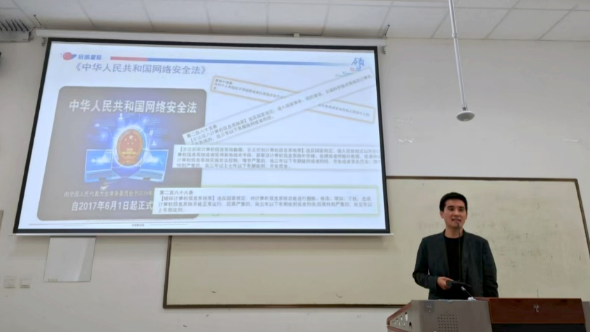 講座共分為“網(wǎng)絡(luò)安全熱點事件”“信息安全與國家戰(zhàn)略”“中華人民共和國網(wǎng)絡(luò)安全法”“信息安全等級保護(hù)測評”“啟明星辰核心業(yè)務(wù)”“網(wǎng)絡(luò)安全人才現(xiàn)狀”六個部分內(nèi)容。孫明從近期發(fā)生的幾起重大隱私泄露事件,包括數(shù)據(jù)泄露、個人信息被非法買賣等熱點新聞著手,使在場師生意識到網(wǎng)絡(luò)安全問題的普遍性、嚴(yán)重性、緊迫性。同時,他對《中華人民共和國網(wǎng)絡(luò)安全法》進(jìn)行了深入解讀,詳細(xì)介紹了法律的主要條款、立法目的和實施意義。最后,孫明分析了當(dāng)前網(wǎng)絡(luò)安全人才的市場需求、培養(yǎng)現(xiàn)狀及發(fā)展趨勢。他指出,隨著網(wǎng)絡(luò)技術(shù)的快速發(fā)展,網(wǎng)絡(luò)安全人才短缺的問題日益凸顯。他鼓勵在座的學(xué)生們積極投身網(wǎng)絡(luò)安全領(lǐng)域,提升自身技能,為國家的網(wǎng)絡(luò)安全事業(yè)貢獻(xiàn)力量。同時,他還分享了啟明星辰在人才培養(yǎng)和職業(yè)發(fā)展方面的舉措,為學(xué)生們指明了前進(jìn)方向。