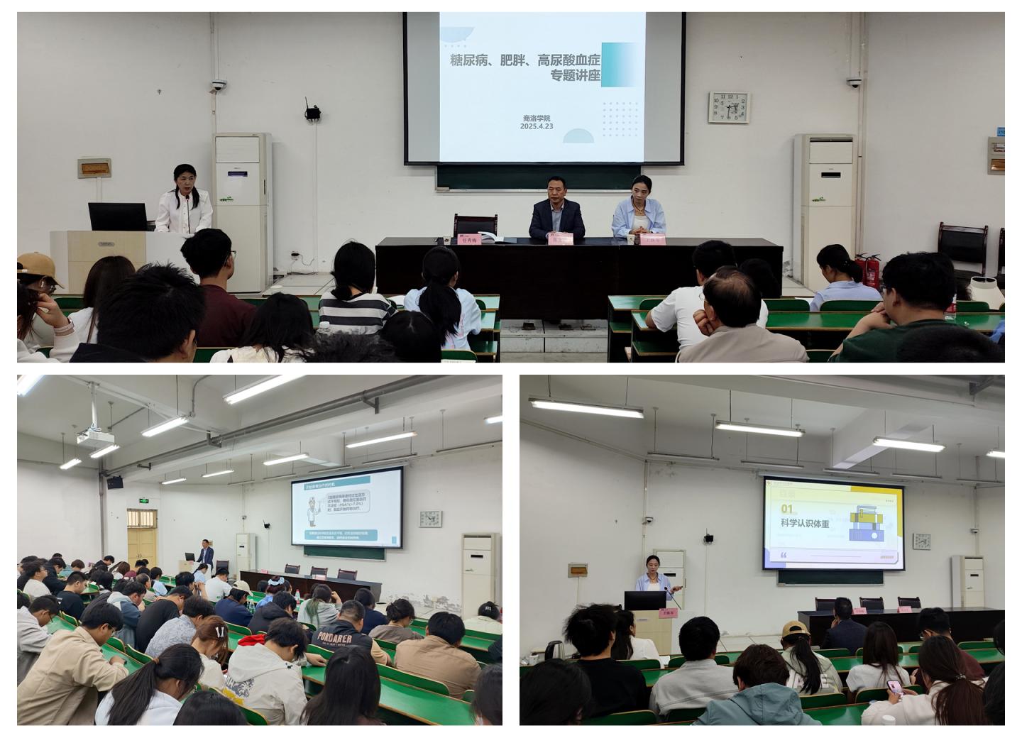 講座上,張友杰從糖尿病病因誤區(qū)入手,分別對糖尿病病因、臨床表現(xiàn)、診斷、危害,高尿酸血癥、痛風的病因、診斷、治療原則及目標、飲食與營養(yǎng)、預防等方面進行了通俗易懂的講解,最后向師生提出了幾點預防痛風發(fā)作的實用建議。衛(wèi)姝岑醫(yī)師從減重問題由淺入深,破除“體重中心論”,建議師生合理膳食,堅持適度運動,用科學的方式保持健康的體重與身材?;迎h(huán)節(jié),現(xiàn)場師生就自己心中的疑惑踴躍舉手提問 ,兩位專家對師生提出的健康管理、用藥、就醫(yī)方面的問題進行了耐心細致的解答。