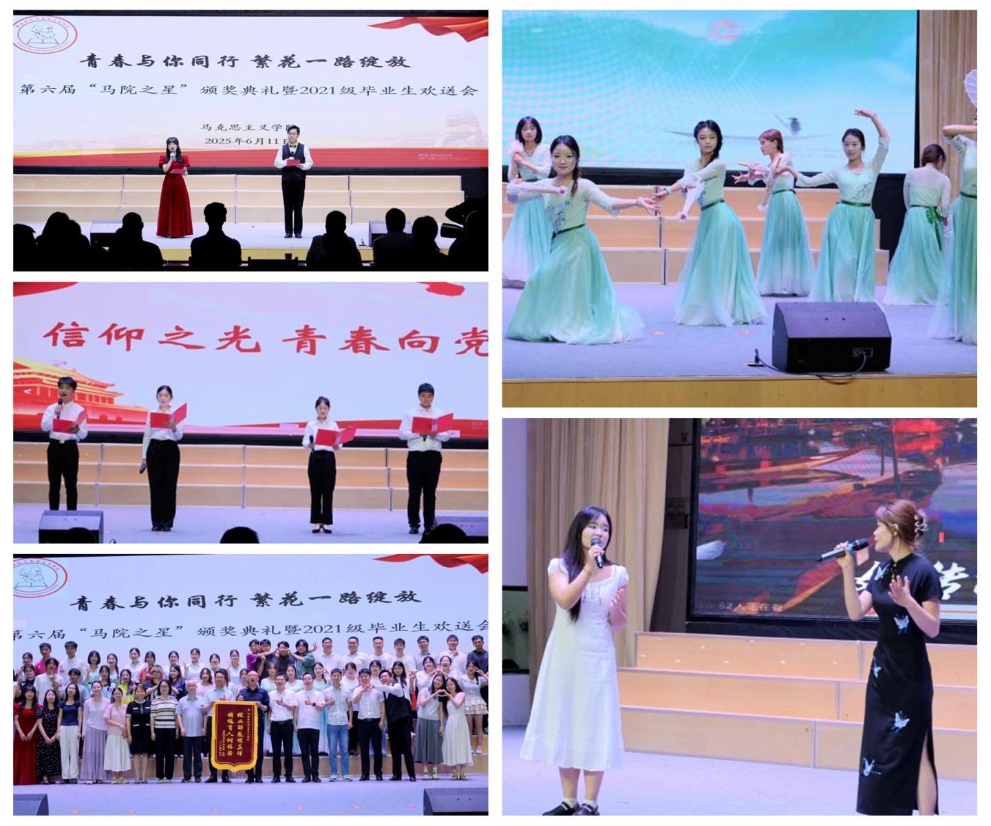 晚會(huì)環(huán)節(jié)精彩紛呈,高潮迭起。舞蹈《雨澗春行圖》、歌曲《青花瓷》、朗誦《青春向黨·信仰之光》、師生合唱《鳳凰花開(kāi)的路口》等節(jié)目充分展現(xiàn)了馬院師生團(tuán)結(jié)奮進(jìn)、昂揚(yáng)向上的精神風(fēng)貌,為畢業(yè)生們留下了難忘的校園回憶。